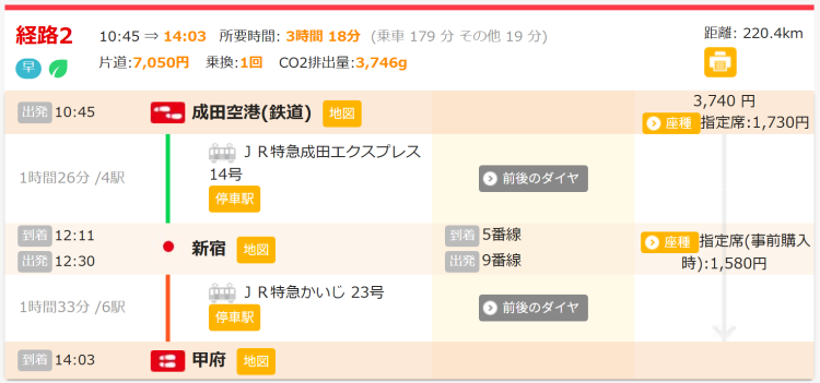 약 3시간 18분이 소요되고 운임은 7,050엔입니다.